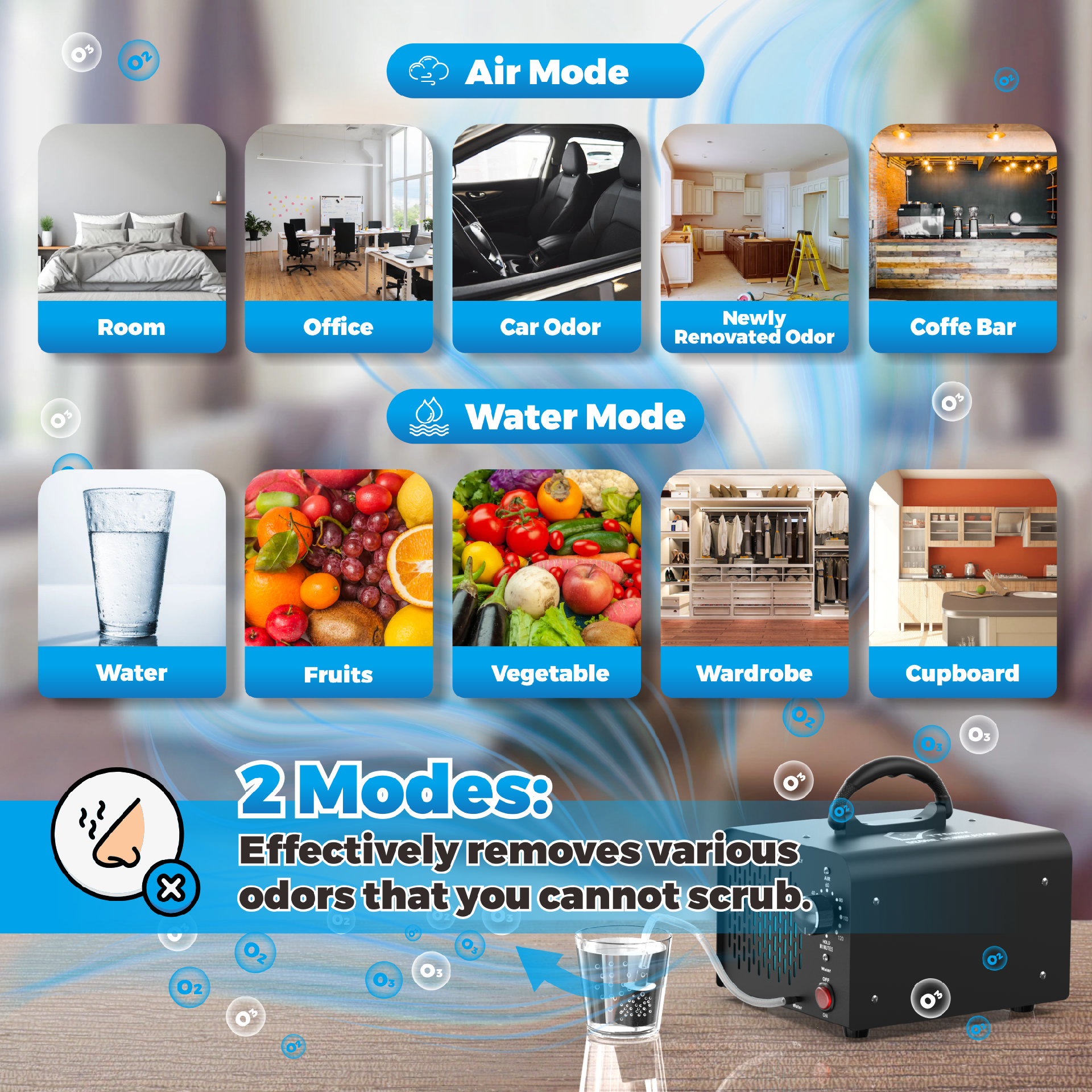 2-IN-1 MODE: Water mode suitable for some smaller spaces and air Mode For larger spaces, the smell is more intense. And the output of 38,000mg/hour can quickly eliminate all kinds of odors in the space. Promotes health and comfort, improving quality of life.